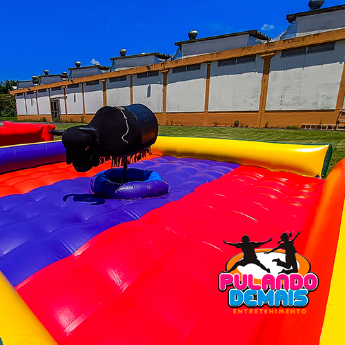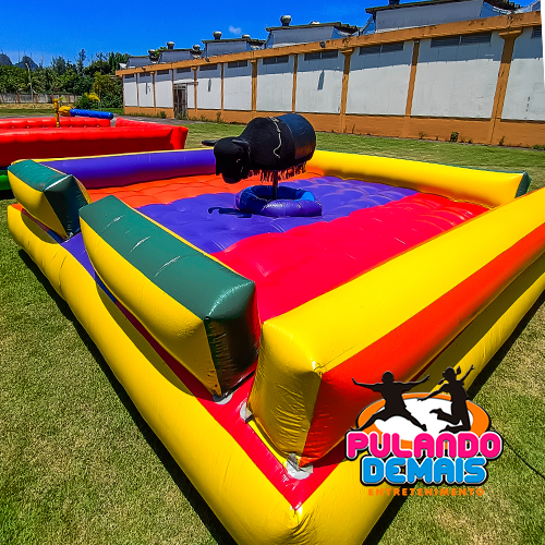 No Touro Mecânico, o participante deve tentar se manter montado enquanto o brinquedo gira, e se cair, a queda é amortecida por um colchão inflável super macio e seguro.